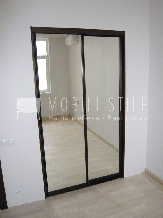 Раздвижные двери в гардеробную из алюминиевого профиля, со вставками из зекркал. Обратная (тыльная) сторона зеркала армирована пленкой безопасности. Это очень важный нюанс для безопасности Вас и Ваших близких.