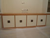 Мебель изготовлена из МДФ окрашенный в жемчужно-белый цвет итальянской эмалью ICA по кодировке Ral 1013, с финишным покрытием матовым лаком. Центральная тумба исполнена в натуральном шпоне вишни, покрытом матовым лаком. В фасады тумбы интергирован латунный декор, выполлненный на заказ.