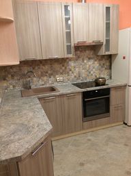 Цоколь – МДФ, окрашенный в цвет фасадов. По длинной стороне кухни цоколь имеет деление. По короткой стороне цоколь выполнен единым.