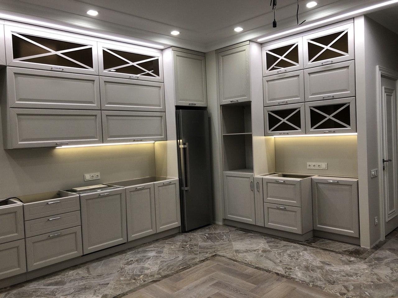 Видимые детали корпусов: боковины, полы, доборы по верху кухни выполнены из плиты МДФ 16 мм. Остальные детали корпусов выполнены из ЛДСП 16 мм в цвете Кашемир серый U702 ST9 (производитель плиты Эггер).