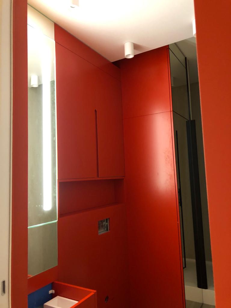 Зеркальный шкаф с подсветкой и зеркало за смесителем.