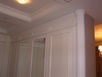 Фасады из МДФ окрашенного и покрытого матовым лаком. Цвет: Ral 9003. Толщина 18 мм. Лицевая сторона окрашенная, тыльная сторона белая ламинация. Рисунок на фасадах выполнен с эксклюзивной фрезеровкой по желанию заказчика. Резные колонны и карнизы выполнены из массива бука, покрытого эмалью. Зеркала имеют красивую скошенную грань - фацет.