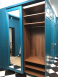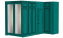 Двери купе (компланарная система): рама Levana, вставка зеркало серебро с пленкой безопасности. Распашные фасады – плита МДФ 19 мм с фрезеровкой. Окрашивание по лицевой поверхности, тыльная сторона – белая ламинация.