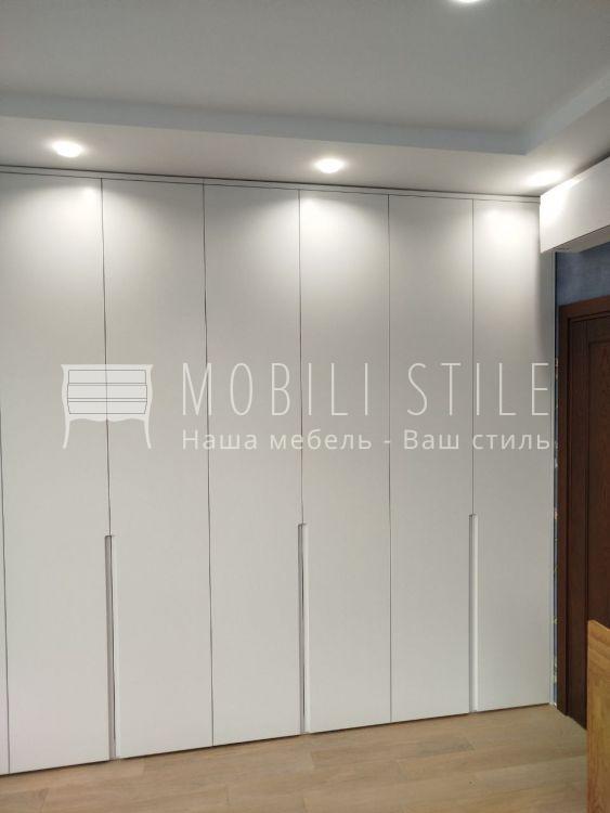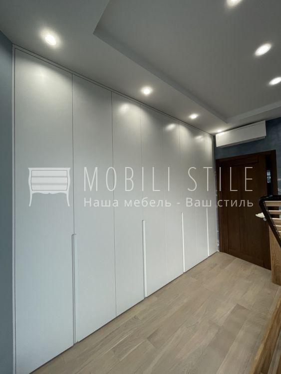 Белый шкаф с интегрированными ручками в нишу вдоль всей стены.