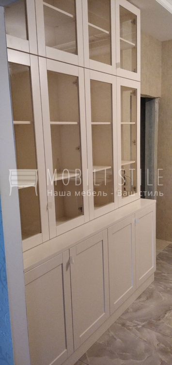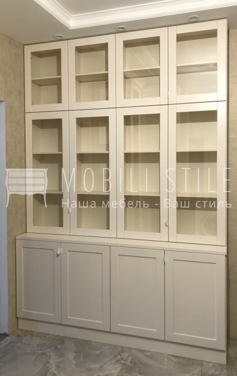 Корпус витрины выполнен из ЛДСП 16 мм в цвете U222 st9 Крем бежевый. Цвет окрашивания фасадов NCS 0804 Y50R, матовая финишная отделка.