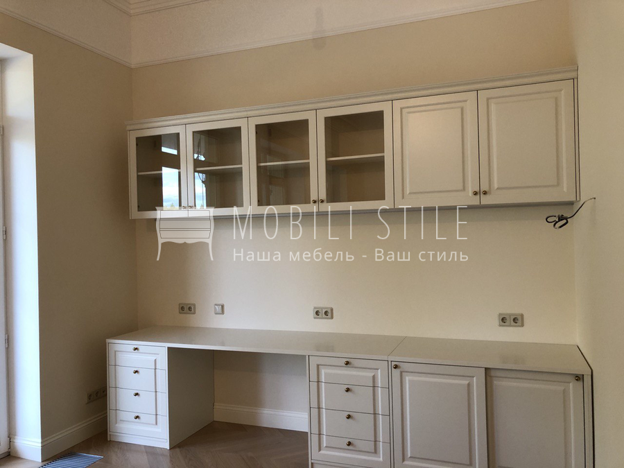 Состоит из навесных полок (центральные фасады со стеклом, крайние глухие) и рабочего стола с тумбами и ящиками.