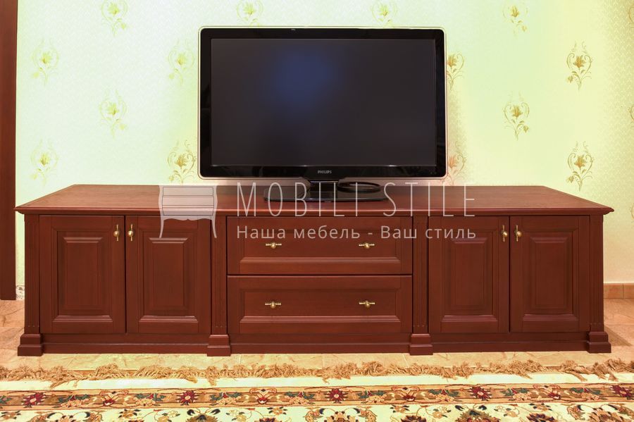 Тумба для телевизора выполнена из мореного массива дуба. Глубокий тон дерева, гармоничные формы подчеркивают классический стиль изделия - модный и актуальный во все времена.