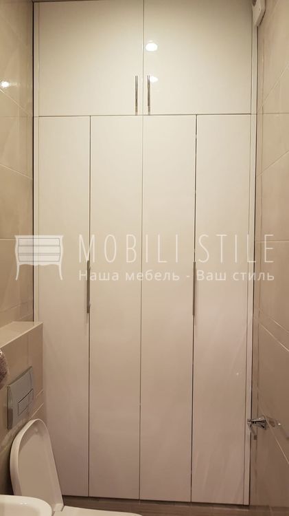 Встроенный шкаф для сан узла с глянцевыми складными дверьми.