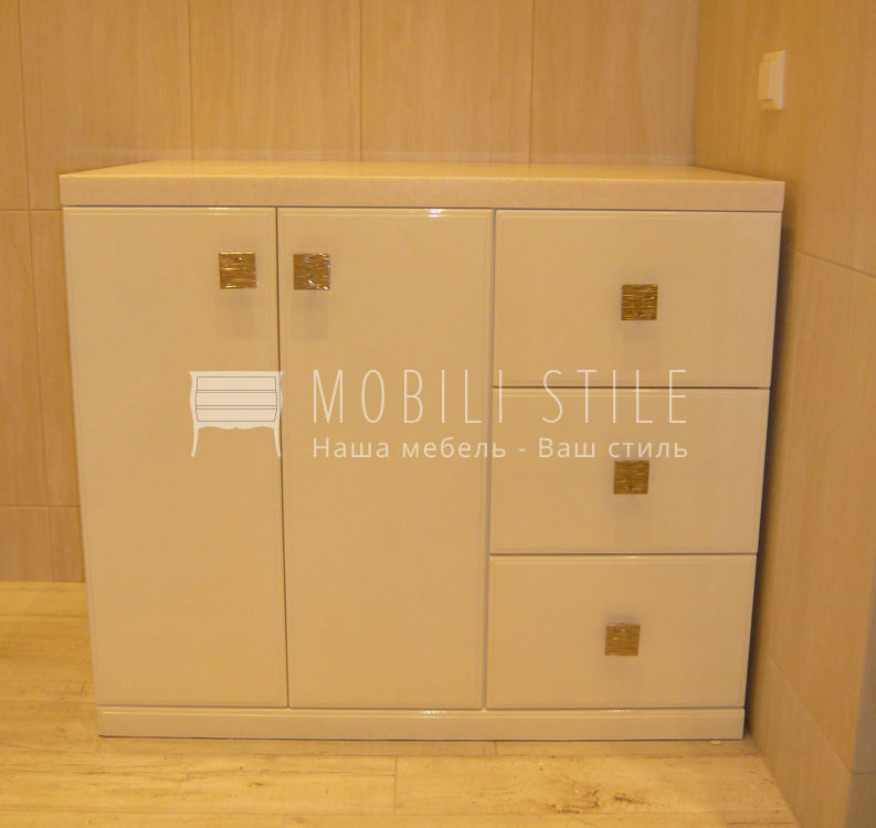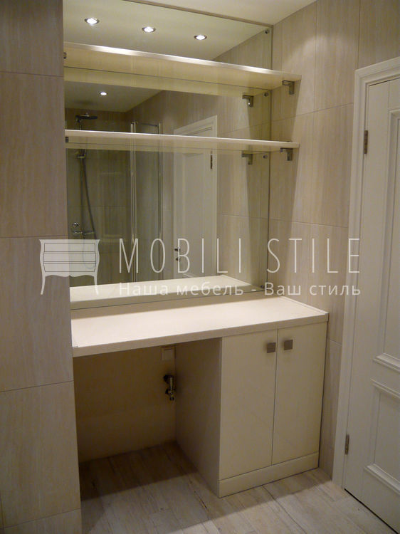 Тумба с ящиками и тумба в нишу для раковины выполнены из белого глянцевого МДФ. МДФ плита окрашена белой эмалью с оттенком, подобранным в соответствии с тоном облицовочной плитки. Финишной покрытие эмали - глянцевый лак от итальянской компании ICA.
