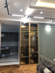 - Стеклянные витрины. Изготавливаются из специального стекла с высокими показателями ударостойкости и травмобезопасности. Смотрятся очень легко и воздушно, участвуют в создании нежных, стильных интерьеров.